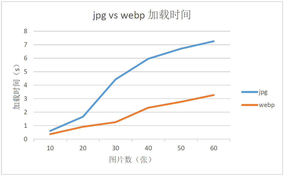 从折线图可以看到,WebP虽然会增加额外的解码时间,但由于减少了文件体积,缩短了加载的时间,页面的渲染速度加快了。同时,随着图片数量的增多,WebP页面加载的速度相对JPG页面增快了。所以,使用WebP基本没有技术阻碍,还能带来性能提升以及带宽节省。