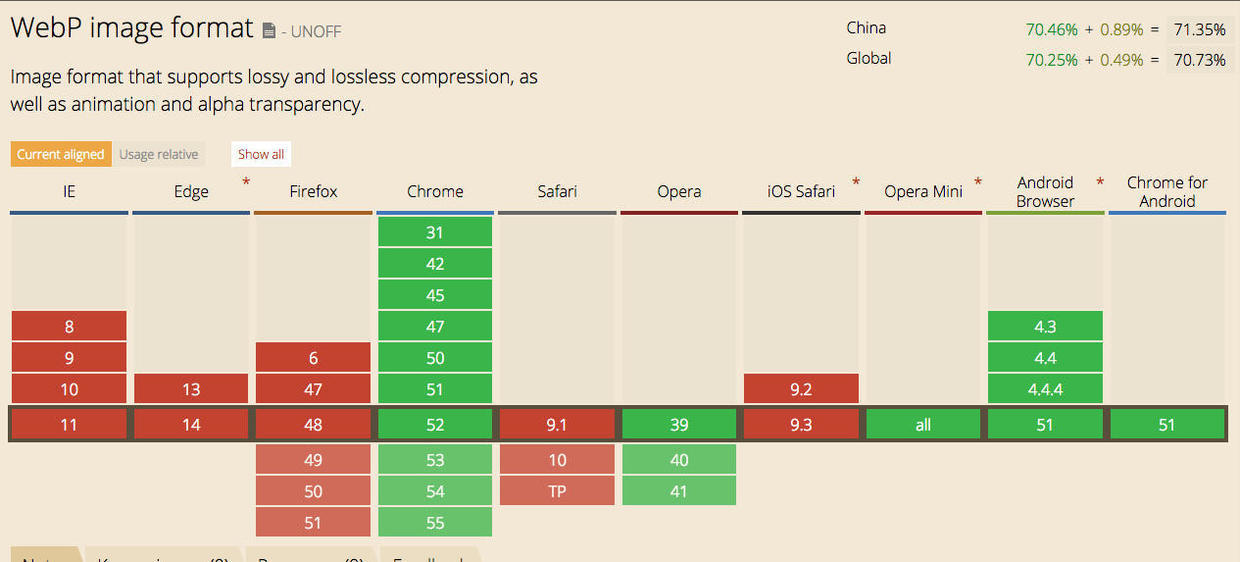 通过以上两组对比可以得知,WebP在文件大小以及传输速度上肯定是拥有优势的,将极大节省用户及cdn流量。