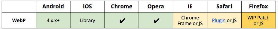 WebP 格式是 Google 于2010年发布的一种支持有损压缩和无损压缩的图片文件格式,派生自图像编码格式 VP8。它具有较优的图像数据压缩算法,能带来更小的图片体积,而且拥有肉眼识别无差异的图像质量,同时具备了无损和有损的压缩模式、Alpha 透明以及动画的特性。目前googleG+、YouTube以及Google Play全站都在使用WebP格式的图片。15年双11手淘前端技术巡演中提到,淘宝3年前native层面就已经支持WebP, 两年前H5页面全面支持。QQ空间装扮、淘宝广告图,Facebook Android也都使用WebP。